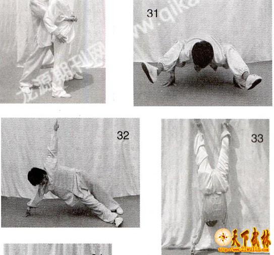 接上式,以两手五指或三指或二指或一指顶地,使身体腾空倒立,能坚持20-30分钟,则此功成(图32、33)。