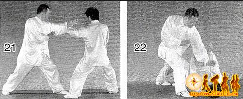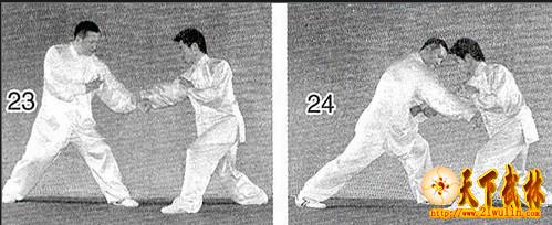 8.罗汉担柴 我突然以左劈山炮向对方头部发动攻击,对方两小臂向外拦截我左手臂以求破解;此时我左手顺势从下向上反抓对方左手腕向怀中拉拧,同时两脚向前上步成“半马步”,以右挑山炮向上挑击对方左腋窝,使其左臂麻木失去知觉(图25、26)。 9.小龙戏水 我突然以右劈山炮向对方胸部发动攻击,对方右掌向外横推我右手臂以求破解;此时我趁机向右后翻身转体,右脚向左脚后上步成“插步”,以左撩山炮从下向上偷袭对方裆部,使其疼痛倒地(图27、28)。 10.临阵脱逃 我突然以左劈山炮向对方腹部发动攻击,对方双手向下抓按我左手臂以求破解;此时我左脚向前上步成“弓步”,以右盖山炮向下猛击对方左肘关节,迫使对方脱手,否则其肘关节必折(图29、30)。 11.仙鹤升天 我突然以左劈山炮向对方腹部发动攻击,对方双手向下抓按我左手臂以求破解;此时我左脚向前上步成“弓步”,以右钻山炮向上钻打对方下颌,使其颌骨脱臼(图31、32)。 12.暗渡陈仓 我突然以右劈山炮向对方头部发动攻击,对方双掌向外缠绕我右手臂以求破解;此时我右拳顺势变掌反抓对方右手腕向外拧旋,随即两脚向前上步成“半马步”,左腿挤靠对方左腿,以左横山炮向前、向外横打对方右腋窝,使其肩关节脱臼(图33、34)。 13.棒打马腿 我突然以左劈山炮向对方头部发动攻击,对方两小臂交叉向上架住我左手臂以求破解;此时我右脚向右前横上步成“横裆步”,以右扫山炮向下、向外横扫对方右腿膝关节里侧,使其膝关节损伤或脱臼(图35、36)。