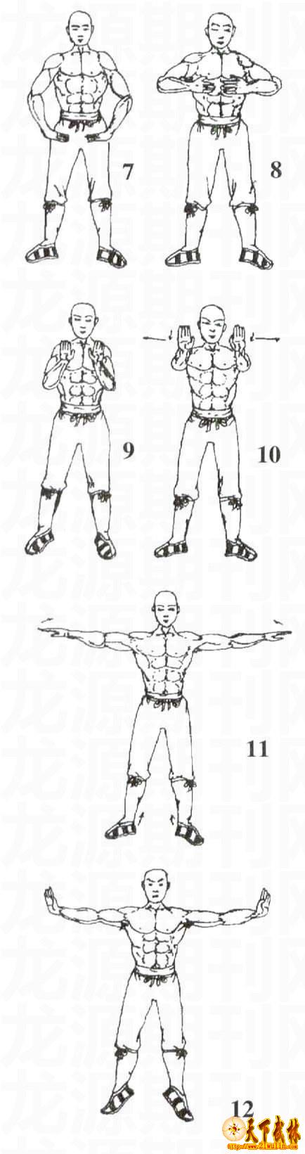 目前武林中贯名“少林”的易筋经功法最多,如“少林达摩易筋经”、“少林韦驮易筋经”、“少林罗汉易筋经”、“少林金刚易筋经”等等,练法各异,五花八门。追溯源流,大都认为是少林嫡传,但真实师承,无从查考。本功依照清代刻本中的易筋经画像和歌诀,重新编释出来,供有兴趣者练习和探讨。 【总歌】 达摩面壁修禅定,僧众神靡根缘浅。 创得易筋导肢体,健身祛病兼延年。 秘传功夫世稀有,少林宗法藏真言。 高境非是一日事,勤学苦练不怕难。