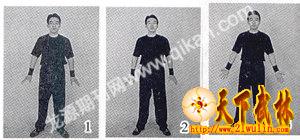 1.身躯正立;两膝自然伸直不必用力,两脚左右离开宽约同肩,脚尖自然外斜;两臂自然伸开,五指自然分开(自然若常,伸而不挺,伸却有弯,名为自然掌。学者要注意这个掌形,以后会经常用到,可顺延参照),两腕略挺,虎口向前,掌心距股约有一拳宽;胸开张,肩后收,颈宜直,颚略收;两眼垂帘,目光下潜;舌轻上卷,微触上腭,闭口合齿,呼吸用鼻(图1)。