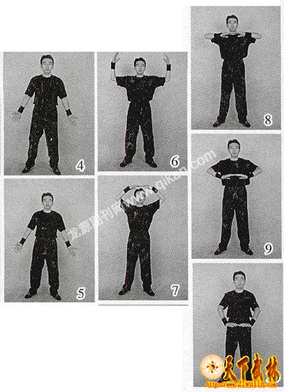4.气贯丹田,不呼不吸,气要暂闭;此时再向上、向里缓举两掌,刚开始时掌心相对,两掌举至头顶变成掌心向下,双掌适度离身,不要紧贴身体,掌指微接(稍稍离点也无妨,不必太过死板,但也不宜相距太远);两膝也渐渐伸开(随着手动,顺势自然伸开);闭气结束,紧接下动(图6、7)。