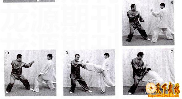 对方两脚突然向前上步,以右劈山炮强取进攻,此时我切不可硬接,以右掌向外横砍对方右手臂,使其产生疼痛;不料对方在手臂受伤的情况下,依然上步进身,以左钻山炮做垂死挣扎,我左掌用力下按,使其不能得逞;随即以右脚向前暗中击打对方风市穴(图55~57)。