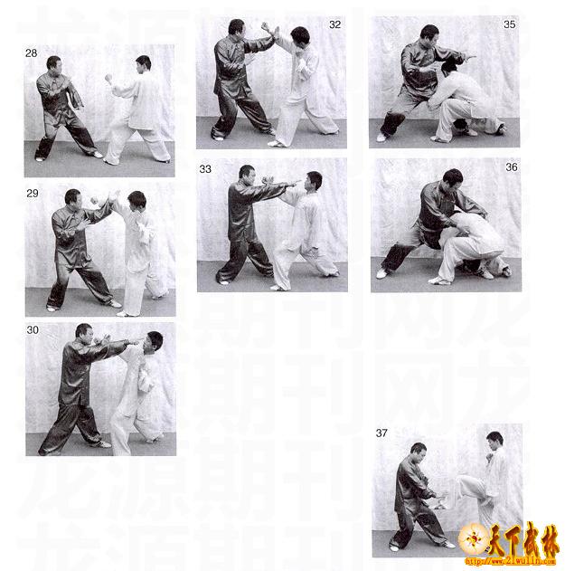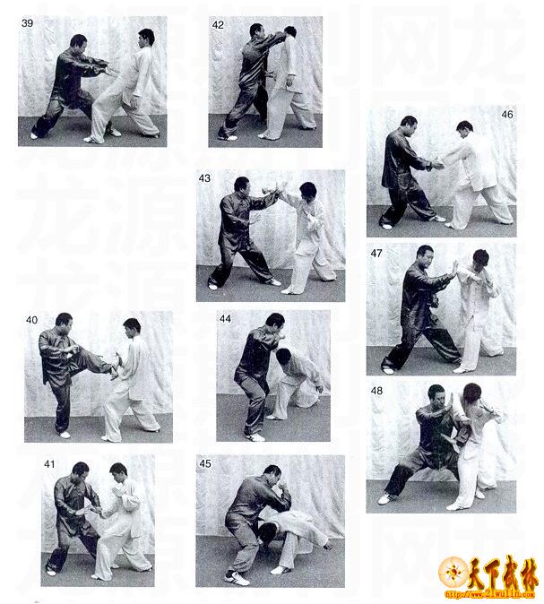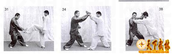 对方以左手向我面部虚晃一招,随即以左脚向我裆部突然发动攻击,我迅速以右掌向下按防;不料对方左脚顺势向下踩落,两手掼山炮同时向我发动攻击,此时我左脚急忙向前上步,双掌同时向外横拨对方两手臂;随即身体稍下蹲,以两掌尖向前击打对方气海穴(图37~39)。