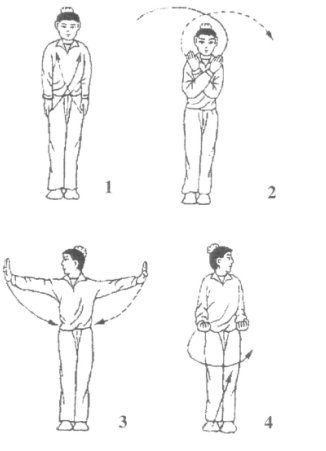 环臂抱拳要圆活、舒展,连贯完成;两掌左右分展时,肩关节要尽量放松伸展,两掌要有明显的外翻动作,环臂过程中目随视右掌。