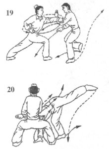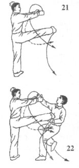 如果乙用力挣脱被拧之手臂,我即随之身体移升,速出右腿猛力踹击乙腰腹部;同时,以双拳迅猛攻击乙面部,使乙顾此失彼,在我拳脚攻击力和自身后挣力的合力作用下仰身跌出;目视乙中上盘(图22)。