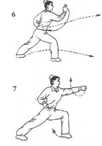 (3)右手抓握变拳,小臂外旋拧拉成仰拳收抱于右腰侧,拳面向前。同时,身体前移,左脚弧形向左前上步,膝略屈;左拳随身体重心前移之势向前冲出,将至击点时,小臂迅速内旋成俯拳抖腕猛力前击,拳面向前,高与肩平;拳至击点的瞬间,左脚即踏实,左腿蹲平,右腿蹬直,两脚前后蹬撑成左登山步。目视左拳(图7)。