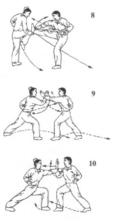 (2)我若抄挂住乙攻势腿,则用力向上抄举;同时,进身上步,用脚别住乙支撑腿,速出左拳猛击乙胸部或面部空位,制乙后倒。若乙收腿出掌攻击我中上盘;我右手则随抄挂之势上拨乙攻势手臂,右腿同时前落逼近乙;目视乙攻势腿或手(图9)。