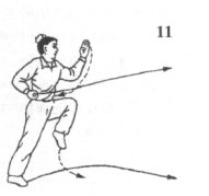 (1)左脚蹬地收提。同时,左拳变八字掌先内收再立掌上挑,掌心由内外翻,以肘为轴,弧形向左立掌外拨,掌指向上;左脚随之前落,脚尖稍外展。目随左掌(图11)。
