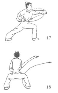 (2)上动不停;身体左转约90°;左掌变八字掌立掌向左上方叼抓变拳,小臂外旋翻腕拧拉,用力向左横挒,停于左腰侧,右拳同时变八字掌右伸,臂将伸直时抓握变拳,小臂内旋与左手一齐向左用力横挒,停于腹前;两腿屈膝半蹲,大腿接近水平,膝和脚尖在同一方向,脚趾抓地用力外撑成骑马步;目随右掌(图18)。