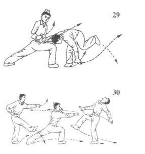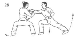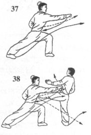 如果乙左脚随势下踩我左仆之腿,我则速出左手搂抓乙下踩腿,同时,右脚蹬地成左登山步,右拳乘势迅速冲出,充分利用身体移升之势抖腕猛击乙胸部或头部空位,使乙后倒;目视乙攻势腿,转视乙中上盘(图38)。