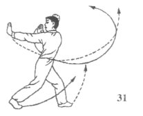 承上动作;左脚向前方跨进上步,身体前移,左腿略屈,脚尖外展,右脚在左脚跨步时略屈膝,脚前掌撑地,脚跟翘起,两大腿贴紧成左赶步;同时,上体左转约90°,右掌变柳叶掌,随上步转体之势与左手柳叶掌一起向后用力推支,左臂伸直平举,掌外侧向左,掌指高与眉齐,右臂屈肘立举,右掌置于左肩前,掌外侧向左,掌指高与鼻齐;眼看左掌(图31)。