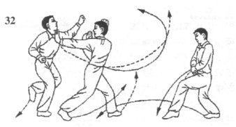 当乙被击,以双手护痛,身形后退,丙已经攻至我身体后侧时,我则左脚迅速向前赶步避让丙攻势,同时,上体左转,速出双掌用力后推,右掌立掌护住下颏,左掌猛力推击丙面部要害空位;目视丙攻势手(图32)。