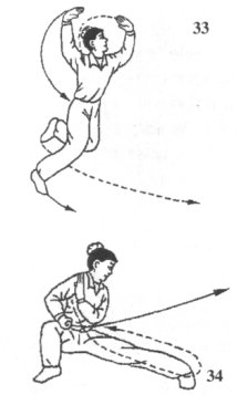(1)承上动作;身体重心移至左脚,右脚用力蹬地,屈膝在身前摆起,左脚随即迅猛蹬地向前蹿跳跃出,身体在空中右转约135°;同时,双掌随蹿跳转体之势下落,经腹前向前上、向右后方立臂弧形摆动,掌心均向右,掌指均斜向上,略高于头;目随视左掌(图33)。
