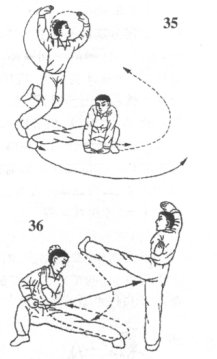 (1)如果乙后跃步离我较远,我即跃步前蹿逼近乙,两掌弧形摆动,既能格挡乙前锋攻势手,防护中上盘,又可以作为虚晃引招动作;我逼近乙后,即蹲身避开其上盘攻势,左脚同时迅速铲出攻击乙踝关节。如果乙乘我赶步之机,以伏地右后扫腿攻击我下盘,我则迅速以蹿跳步避开乙下扫腿;目视乙攻防手或下扫腿(图35)。