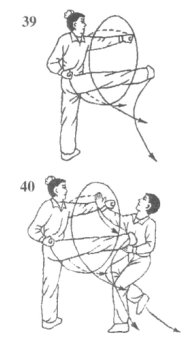 如果乙迅速收落左腿避让我攻势,我则乘势速出右腿猛力踹击乙裆部或腹部要害空位,同时,速出左拳攻击乙胸部或面部空位,使乙顾此失彼而被击中;目视乙中上盘空位(图40)。
