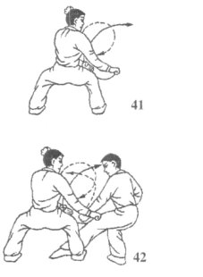 (1)如果乙右脚下落,沉身后坐欲稳住身形,我则右脚迅速前落成骑马步抵顶住乙前锋腿,左手同时仰掌护住裆腹要位,速用右拳猛力抡砸乙中上盘空位或膝关节要位,致乙后倒;目视乙中上盘 (图42)。
