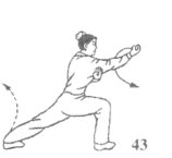 承上动作;左腿蹬伸,右腿屈蹲,身体右转约90°;同时,左掌变八字掌,向前、向右下弧形封按置于右腋下,掌心向右,掌指向上,右拳俯拳屈肘向上,向内弧形抄臂,至胸前时小臂外旋成仰拳向右前上方猛力反臂崩出,拳心斜向后,拳眼向外,高与目齐,拳至崩击点的瞬间,右脚即踏实,右腿蹲平,左腿蹬直,两脚前后蹬撑成右登山步;眼看右拳(图43)。