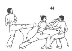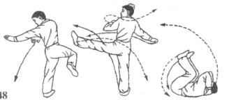 (1)乙如果前锋腿被我抵住,上盘被我崩击,很容易失去平衡而后倒。若丙出腿踢击时,我身形已变,使丙未能踢中,丙必会迅速收腿,换势再击,我则将乙击退后,迅速左转身摆臂护体,迅速收提左腿顺势撩踢丙裆腹部或膝关节内侧,迫使丙退守;目视丙攻势腿及中盘(图48)。