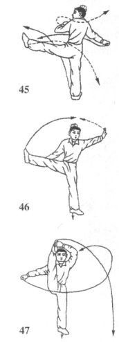 (1)承上动作;上体左转约90°,身体重心移至右腿,左脚蹬地向左后方上摆;目视左下方(图45)。
