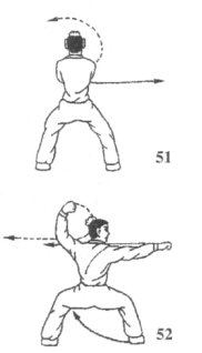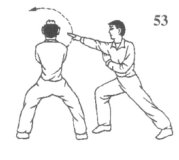 (1)如果乙避开我旋风脚,出拳或掌向我上盘攻击,我则乘落步左转身之势,以右臂里格乙攻势手;目视乙攻势手(图53)。