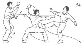 (2)若乙再出手向我上盘连环攻击,我则身体下沉成骑马步,速用左臂上架乙攻势手,同时,速出右拳猛击乙胸部或肋部空位,将其击退。若丙乘机向我左侧逼近,我则目视乙攻势手,余光视丙攻势动向(图54)。