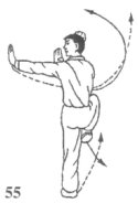 承上动作;左腿踏实,右腿屈膝在身前提起,膝高过腰,脚面绷平,脚尖垂扣于左大腿前,左腿直立,脚全掌着地,脚趾抓地撑稳成左独立步;同时,左拳变柳叶掌下落至右肩前,掌心向右,掌指向上;右拳变柳叶掌,随身体重心移升之势与左掌一起立掌向左用力推支,左臂伸直平举,掌外侧向左,掌指高与眉齐,右臂屈肘立举,右掌置于左肩前,掌外侧向左,掌指高与鼻齐;眼看左掌(图55)。