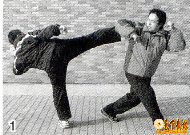 双方对峙,对手突用右高侧踹腿攻踢我头部。我快变应动,身体向右后转动闪化来拳,同时发右横摆肘扫击破化来腿,且我左手回护脸前 (图1)。
