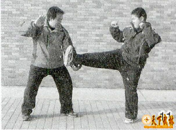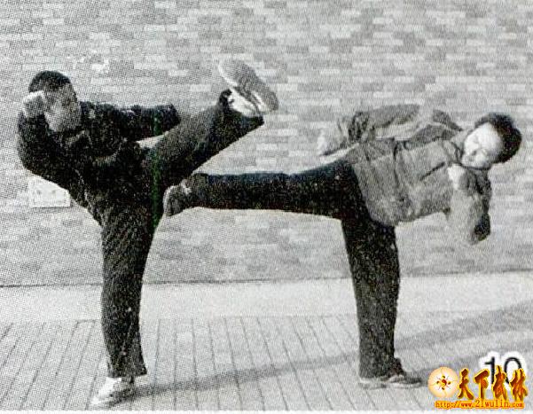 双方对峙,对手突用左摆腿攻踢我头部。我快动应变,侧闪步发右侧踹腿踢击对手裆部,左手回护脸前,将其踢倒 (图10)。