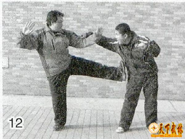 双方对峙,对手突用右蹬腿攻踢我胸腹部。我快动应变,上体向右转用左手臂向里抄挂破化来腿。对手随落步连发右摆拳攻打我头部,我疾用左手向外挡化来拳,同时发左蹬腿狠踢其侧肋 (图11、12)。