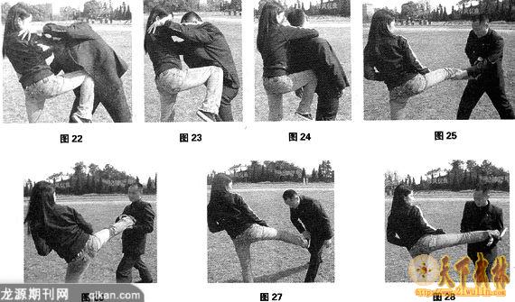 夺命膝法,是泰拳选手的常用武器。膝近距离攻击,弱小女子的膝也是威力无比的。用膝可顶、可冲、可撞、可砸。如用膝前冲搂抱之敌的裆腹部(图22);用膝内扣击敌之肋部(图23);用膝顶击敌之腰部(图24)。