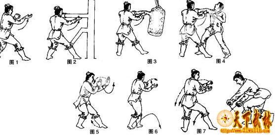 2、木人桩练习:面对木人桩手臂站立,身势稍右移,右脚避开木人桩手臂,向右前上步,左腿略屈蹲,右脚蹬地使身势左转后坐;同时左手经面前左拨木人桩手臂,随即刁抓住桩臂端,用力外旋向左后拧拉,右手外旋成仰掌用力向左手前抖托桩臂中段。意力运达两手。目视桩臂前、中段(图2)。要注意体会拧拉抖托桩臂时,桩臂前、中段的抗衡感。