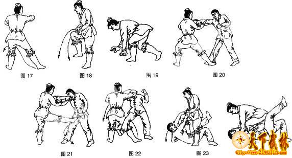 4、承上动作,双手继续用力向左下扌列 拉,身势随之左转前俯,左腿独立撑稳,右腿屈膝前提,随即右脚猛力向身前下踩。意力运达右腿跟及两手十指。意在将对方仰摔于地后,以右脚跺踩其中盘要位,致使对方中盘受伤而失去攻防能力。目视右脚(图18)。