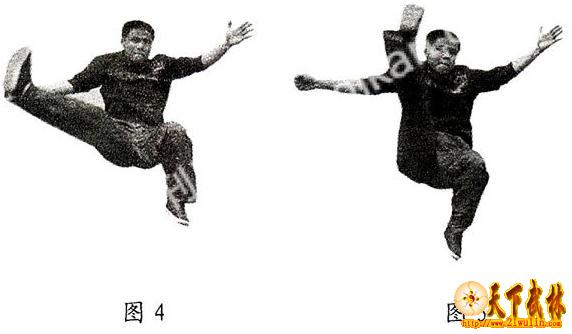 | 旋风脚是我国武术中的高难度动作。要求在跳跃腾起时,沿纵轴旋转摆动腿直摆或屈膝收控,起跳腿伸直里合,腾空转体270度时,左手与向里合的右脚击响,在空中完成360度落地(见图1至图6)。从旋风脚的动作可以看出,手脚相击时,脚的高度与头平齐,比未跃起时的头部略高。所谓中华武术之南拳北腿,腿之击长击高由此可特别体现。 此是今天人们所见的旋风脚。旋风脚的远房古亲是什么样的呢? 古代齐国提倡技击,每年都召集天下武士比试较量,从中选拔武艺高强的人才,称为春秋角试。到春秋战国时代,中华武学已百家争鸣。其中的无为武学,将老子道家“无为”学说融入武学,构成了一套完整的武学体系,其中的旋风脚一式,与今天的各武术拳种以及套路相异,在此整理出来,让有兴趣的武友赏习。 春秋战国旋风脚基本技术