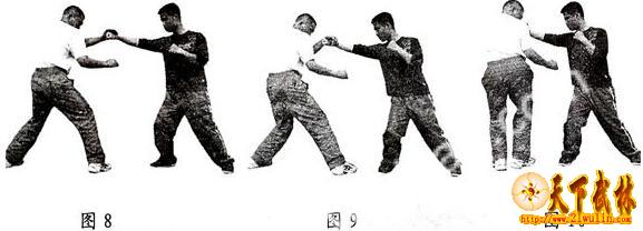 敌我双方对峙(我方穿白色上衣,敌方穿黑色上衣,下同),双方皆右手前置(图7),这是因为人们多习惯于右手,右手较左手有力,右手前置,首发就可重击,从而淘汰如西洋左手试探性剌拳的姿态。敌方右拳击我面部,我用左手拍压敌来拳(图8、9),同时,我右腿前踏,左腿旋转近90度跟进(图10),左腿落地前瞬间,右腿向敌裆部扫击(图11、12),如若重力击打,这一腿将结束搏斗,成为终了打击。脚后跟外侧部位作为打击终端。 如我右式,敌左式,则攻击点变为向敌臀部扫击,重力击打也将致敌重创,这时我处于敌背部有利位置,可以从容进行终了打击,如小垫一步作调整,右脚掌铲击敌腿弯委中穴。 我方也可右拳主动出击敌头胸部,这是一记重击。目的是打敌上路,使敌双手防护我时不及防范下部。这时,无须用左手拍压敌来拳,我方直接将右腿前踏,左腿旋转近90度跟进,左腿落地前瞬间,右腿向敌裆部扫击, 旋风脚主要特点是:1.以压制为先,特别是在我方右拳主动出击中;2.打阴非打头,体现简洁凶狠特点;3.无跳跃动作;4.是一招可制敌。 古代武术讲防守就是控制,它在控制的同时进行反击。春秋旋风脚中的制法体现了中华古代武术的科学性。 旋风脚基本要点 我方右拳掌握在对方有效距离内,可根据实际情况用步法来调整距离,无论是右拳吸引,还是左拳拍击,必须具备相当力度,这是要先保证保护自己,不与敌同归于尽,以确保威慑及防护有效,我方右腿前踏,左腿旋转跟进的动作与右拳击打无间配合,为后续旋腰带腿扫击创造势能。左腿落地前瞬间,有腿向敌裆部扫击,只有这样,才能保证敌方不致逃脱,并充分利用了人体前冲动能,保证动作的期望效果。左腿落地时,根据对方位置,我脚掌可调节角度,称作磨盘步,脚掌轴线与敌方双脚连线大体成平行。用脚后跟外侧击打。右腿扫击充分利用腰的旋转力与人体前冲动能。