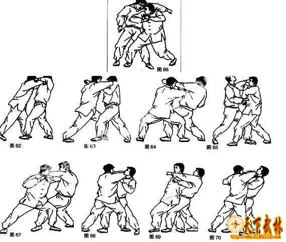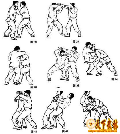 19.猛虎出林 对方右脚前上一步,同时用右直拳向我面部击打;我左脚前上一步,同时用两手向右上捧架对方右拳 (图37)。动作不停,我有手抓握对方右腕向右回领其臂,同时进左脚成马步,同时用左肘顶击对方胸部 (图38)。 动作要点:捧封对方右拳要及时,架领对方右臂前上左脚、与顶击肘要一致,左肘顶击要快速、准确、有力,力达肘尖。 攻防效果:捧架臂可防开对方右冲拳,上左步可挂住对方右腿使其步法不能变化,顶击肘可导致内脏损伤,甚至造成死亡。 20.金蝶采花 对方左脚前上步,同时用两手抓住我胸部衣襟 (图39)。我右脚前上一步,同时用左手按于对方两手掌背上方,将对方掌按固于我胸前,上体左转,同时用右肘向左横击对方左耳部 (图40)。 动作要点:按对方双掌于我胸前要牢固;右肘横击对方头要快速、准确、有力,力达肘尖。 攻防效果:按对方双掌使对方两掌不能变化;顶肘击对方左耳部,可导致对方耳鸣眼花,头晕目眩,甚至造成死亡。 21.金蝉脱壳 对方由我身后,张开双臂,将我后腰连同双臂抱住;我速向外撑对方双臂并向上抬 (图41)。动作不停,我将对方双抱臂解开后,双肘向后猛撞对方两肋 (图42)。 动作要点:外撑臂、上抬臂要及时;后撞肘顶击对方两肋要快速、准确、有力,力达两肘尖。 攻防效果:两臂外撑、上抬,可使对方两臂抱我腰而失效,肘顶对方肋可导致对方肋骨折伤,造成内脏损伤或死亡。 22.双龙戏珠 对方右脚前上一步,同时用两臂向前下抱住我右腿向上提 (图43),我速用两肘向里夹击对方头部 (图44)。 动作要点:左腿支撑要稳,两肘夹击对方头要及时,快速、准确、有力,两肘向里同时用力,力达肘尖。 攻防效果:夹击两肘可使对方头部受伤,导致脑震荡,耳鸣目眩,头昏眼花,甚至死亡。 23.双燕齐飞 对方左脚前上一步,同时用两拳向我两耳部扌贯 击;我左脚前上步,同时用两臂从对方两臂内侧外分并后挂 (图45)。动作不停,我右脚前上一步,同时两臂屈肘向前下顶击对方胸(图46)。 动作要点:挑挂对方双臂要及时,向外用力并后引;上步要快速,双肘前下顶击要迅猛、准确、有力,力达肘尖。 攻防效果:外分臂可防开对方的双扌贯 拳,双肘前下顶砸可导致对方胸受伤,伤及内脏,甚至造成死亡。 24.金鸡抖翎 对方左脚前上一步,同时用右拳向我腹部击打;我左脚在前,同时用左手向外搂开对方右拳 (图47)。动作不停,我右脚前上一步,同时用左手抓握对方右腕向左后领,并用右肘向对方左耳部横肘拐击 (图48)。 动作要点:搂手防拳要及时;上步要快速,上步与拐右肘要一致,拐击对方左耳部要快速、准确、有力,力达肘尖。 攻防效果:搂手可防对方的左拳攻击;拐肘横击对方左耳部可使其头部受伤,导致脑震荡,造成耳鸣眼花,头晕目眩,甚至死亡。 25.狸猫上树 对方右脚前上一步,同时用右拳向我面部击打而来;我向左闪身,躲开其来拳 (图49)。动作不停,我左腿支撑体重,同时用右膝撞击对方腹部,用右肘顶击对方后背 (图50)。 动作要点:闪身躲拳要及时,撞膝、顶肘要一致,顶、撞要快速、准确、有力。 攻防效果:闪身可改变身位和与对方相处的角度,使对方右冲拳失效;撞膝、顶肘可造成对方内脏损伤,甚至造成死亡。 26.罗汉把门 对方左腿支撑身体,同时用右腿向我裆部弹踢,用左拳向我面部击打;我右脚速向右一步,同时用左臂向我搂开对方右腿,用右掌向上挑架开对方左拳 (图51)。动作不停,当对方右腿后抽步时,我右脚前上一步,成为右弓步,左手握住右腕,同时用有肘顶击对方胸部 (图52)。 动作要点:搂手防腿,架掌防拳要及时;上步要快速,右肘顶击对方胸要迅猛、准确、有力,力达肘尖。 攻防效果:搂架手可防开对方拳脚的踢打;上步可绊住对方左腿,使之不能变化;右肘顶击对方胸可导致对方内脏损伤,甚至造成死亡。 27.湘子挎篮 对方右脚前上一步,同时用右拳向我胸部击打;我左脚前上一步,同时用右手向外刁抓住其右腕回领 (图53)。动作不停,我握对方右腕向右后领臂的同时,用左肘向前挑挎对方右肘关节 (图54)。 动作要点:刁抓腕防拳要及时;挎挑其肘关节要反关节,挑挎要快速、准确、有力,力达肘尖。 攻防效果:刁抓腕可防开对方左拳的击打;挑挎肘可导致对方右肘关节被折或脱位,造成其伤残,使之疼痛难忍,不能动弹。 28.韦陀拦门 对方左脚前上一步,同时用左拳向我面部击打;我右脚在前,头向左偏,躲开其拳,并用左手将对方左拳按固于我右肩上 (图55)。动作不停,我右拳上举后屈肘向下砸击对方左肘关节或腕关节 (图56)。 动作要点:偏头躲闪要及时,按对方左手要牢固,下砸肘截对方左腕要快速、准确、有力。 攻防效果:偏头闪身可躲开对方的攻击;按对方左拳可防止对方抽左臂而变化方法;砸截肘可导致对方肘或腕关节脱位,产生剧痛,而不能动弹。 29.合门闭院 对方左腿支撑体重,同时用右脚向我裆部弹踢 (图57)。我两腿屈膝下蹲,同时用右肘向下砸击对方右腿胫骨 (图58)。 动作要点:下蹲要及时;顶肘下砸对方胫骨要快速、准确、有力,力达肘尖。 攻防效果:下砸顶肘可防止对方右腿的踢击,保护裆部。 30.灵猫扑凰 对方右脚前上一步,同时用右拳向我胸部击打;我速前上右脚,同时用左手刁抓住对方右拳腕,并用右肘顶击对方胸 (图59)。动作不停,当对方右脚后退一步,躲我右肘,同时我左脚跟进一步,左肘由左向右横向拐击对方右耳侧 (图60)。 攻防要点:抓腕领臂要及时;顶肘要快
