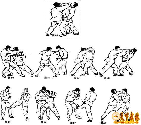 攻防效果:搂手可防开对方的右拳勾击;挑肘击喉可造成对方呼吸、饮食困难,上右步能接近对方身,使右肘撞击发挥威力,顶肘击胸可造成内脏损伤,危及其生命。 34.飞龙引凤 对方左脚前上一步,同时用左拳向我面部击打;我速向右闪身,前上左脚,同时用左肘顶击对方胸部(图67)。动作不停,我两腿跳换步,同时用右肘向前上挑击对方下颌 (图68)。 动作要点:上步要快速,顶肘要在上步、闪身同时完成,顶胸要猛狠;跳换步要快,防止其在我跳换步时变化步子,挑击对方下颌要快速、准确、有力,力达肘尖。 攻防效果:上步能贴近对方身,顶击对方胸部可使之内脏损伤,危及其生命;挑击其下颌还可使其颌关节脱位,影响饮食,使之造成生命危险。 35.青松迎客 对方由我身后,前上左脚一步,同时用左拳向我背后击打而来;我速右闪身,后撤右脚一步,同时用双肘向后撞击对方胸部 (图69)。 动作不停,身体右后转,同时用右肘向右侧顶击对方面部 (图70)。 动作要点:闪身要及时,撤步后撞双肘要一致,转身撞右肘对方面要协调,动作要连贯,顶撞肘要快速、准确、有力,力达肘尖。 攻防效果:闪身可改变身位,破坏对方攻击角度,后撞肘顶击对方胸可造成内脏损伤,顶击面部可致使对方头晕目眩、口鼻流血,甚至造成生命危险。 36.丹凤朝阳 对方左脚前上一步,同时用右拳向我腹部击打;我左脚前上一步,同时用左臂下压砸对方右腕,防开其右拳,并用右肘向前上挑击对方下颌 (图71)。动作不停,我上身右后转,同时用左肘向右拐击对方面 (图72)。 动作要点:压砸对方右腕及时,向下用力,挑肘击对方下颌要准狠,拐肘击对方面要与转身协调一致,拐击要快速、准确、有力。 攻防效果:压砸对方右腕可有效地防开对方右拳的击打;挑肘击颌可使其下颌关节脱位,造成不能言语和饮食困难;拐肘击面可导致对方头晕目眩,口鼻流血,甚至死亡。 37.春风迎面 对方由我左侧欲张开双臂搂抱我腰时;我横开立步站立,速用左肘向左上顶击对方面部(图73)。当对方后仰身躲闪时;我速向左转身,用右肘向左横向拐击对方面部(图74)。 动作要点:左顶肘要及时,准狠;右拐肘与转身要协调一致,拐击对方面要快速、准确、有力,力达肘尖。 攻防效果:左顶肘可击中对方面,解破对方的搂抱腰,拐肘可再次击中对方面,加重其击打力,导致对方耳鸣、头晕、目眩,甚至造成死亡。 38.就地栽花 对方左腿支撑身体,同时用右腿向我裆部弹踢而来;我右脚右跨一步,两腿屈膝下蹲成马步,同时用右肘下顶击对方右腿股骨 (图75)。动作不停,我身体重心右移,同时右肘向右侧顶击对方胸部(图76)。 动作要点:下顶肘防故右弹腿要及时;右侧顶肘击对方腰要快速、准确、有力,力达肘尖。 攻防效果:下顶肘我防对方右弹腿,使对方右腿疼痛难忍;侧顶肘可导致对方内脏损伤,使其失去生理攻能,甚至造成死亡。 39.虎吞弱羊 对方前上左脚,同时用左拳向我腹部击打;我左脚前上步,同时用右拳下砸开对方左拳,并用左拳击打对方面部(图77)。动作不停,我右脚前上一步,同时用右肘顶击对方胸部(图76)。 动作要点:砸拳防对方左拳要及时,向下用力;击打对方面要快、准;顶胸与上步要一致,顶胸要快速、准确、有力,力达肘尖。 攻防效果:砸拳可防开对方左拳的击腹;左拳击打对方面可使对方失去连击能力,导致头晕目眩,耳鸣眼花,口鼻流血;顶胸可导致对方内脏损伤或造成死亡。 40.饿虎扑食 对方格斗预备势站立,欲向我进攻;我右脚抢先右前上步,同时用左拳由下向前上勾击对方腹 (图79)。动作不停,右脚前上一步于对方左腿外侧后方挂住其腿,同时用右肘顶击对方胸部 (图80)。 动作要点:左勾拳击打对方腹部要突然、快速;上步要快,绊腿要牢,顶击其胸要猛、准、狠。 攻防效果:勾拳击胸与顶肘击胸可导致对方内脏损伤,造成生理失调,甚至死亡。 41.黑熊抖膀 对方左脚前上成格斗预备势,欲向我发起进攻;我右脚抢先前上一步,同时用右拳向对方胸部击打 (图81)。动作不停,我左脚前上一步,同时用右肘向左横向拐击对方左耳侧(图82)。 动作要点:上步要快,右拳击打要猛;左脚前上与右拐肘要一致,拐肘要快速、准确、有力。 攻防效果:右拳击对方胸可阻止对方的进攻,可导致对方内脏损伤;右拐肘可使对方耳鸣眼花,头晕眼前黑,甚至造成死亡。 42.野兔穿洞 对方格斗预备势站立,欲向我进攻;我速前上左脚一步,同时用右拳向面部击打 (图83)。动作不停,我右脚前上一步,同时用右肘向前上挑击对方下颌 (图84)。 动作要点:右拳击对方面要突然,快速;上右步与挑右肘要一致,挑肘击对方下颌要快速,准确、有力,力达肘尖。 攻防效果:击对方面可阻止对方的进攻,可导致对方头部受伤,造成头晕目眩,口鼻流血,挑肘击颌可导致对方下颌骨脱位,造成语言和饮食困难,加重头部损伤程度。 43.喜鹊蹬枝 对方格斗预备势站立,欲向我进攻;我左腿支撑身体,同时用右腿踹击对方左膝关节 (图85)。动作不停,我右脚落地成为马步,同时用右肘顶击对方胸 (图86)。 动作要点:支撑腿要稳,踹击对方膝要反其关节,踹击要准、狠;落步、顶肘要一致,顶肘要快速、准确、有力,力达肘尖。 攻防效果:踹膝可阻止对方的攻击,断折其腿;顶胸可导致对方内脏损伤,造成死亡。 44.南门蹋斗 对方格斗预备势站立,欲向我进攻;我左腿支撑体重,同时用右腿踩击对方膝关节 (图87)。动作不停,我右脚后落步,同时用右肘向前