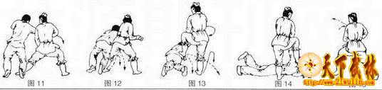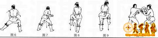 二、单操技法练习之一 1、由并步站立式,右脚向后撤步,右腿屈膝,膝和脚略外展,左脚前掌抵地,膝和脚略内扣,身体后移沉坐成左玄机步;同时,左手左上起经面前向右下封扣,高约肩平,身体随之左移略右转,右手经身前左上起于左小臂前,掌心向前,意力运达两手。意在于撤步闪身中封扣对方中上盘攻势手。目视右手(图5)。 2、承上动作,左手继续向右下扣按之同时,右手迅速内旋经左手外上侧向右拨抓,用力外旋翻拧,身体随即右转前移,成右横裆登山步助增发力,以左肩臂前外侧向右前猛力抖撞,右手同时向右后用力拧掰,意力运达右手五指及左肩臂前外侧。意在乘转身拧拉对方攻势手腕之势,以左肩臂抖撞和右手拧掰将对方攻势手肘臂折伤。目随右手,转视左肩(图6)。 3、上动作不停,右手继续用力向右后拧拉,身体右转之同时,左脚用力向左后滑蹬成右登山步,左肩随势用力向前下顶压,或翻起左手用力向身前推按,意力运达左肩臂外侧及两手十指,意在以反关节技法压折对方肘臂,迫使对方前仆于地。目视左下方(图7)。 4、承上动作,两手用力向右后拧拉,身体重心移至右腿,右腿独立撑稳,左腿屈提,左脚随即向身前猛力跺踩,意力运达两手十指及左脚跟。意在乘对方仆倒后,即控制住对方手臂,以左脚下踩对方中盘要害空位。目视左脚(图8)。 5、承上动作,两手继续用力拧按,左脚略回收,左腿略屈撑稳,右腿屈提,右脚随即向身前猛力跺踩,意力运达两手十指及右脚跟。意在以双手控制住对方手臂之同时,以右脚下踩对方头颈或上盘要害空位。目视右脚(图9)。 三、实用制敌运用之一 1、我与敌对峙,如果敌右脚进步逼近我,左拳虚晃引我攻防注意力,出右拳直击我头面或胸部要位;我则右脚速撤步,身体左闪右转,后移沉坐,以左玄机步避敌拳击路线;同时,左手左上起经面前向右下封扣敌右腕臂,右手臂同时左上起护住中盘。运劲要饱满,发力要深沉,意力运集于两手。目视敌右拳臂(图10)。 2、我左手向右下用力封扣敌右腕之际,右手迅速从左手外前侧上起右拨换抓住敌右腕用力向右下外旋拧拉,使敌右肘关节外侧向外,身体随之右转前移,成右横裆登山步助增发力,速以左肩臂前外侧猛力抖撞敌右肘关节外侧。运劲要充沛,发力要猛烈,意力运集于右手五指及左肩臂前外侧,致使敌右肘臂折伤。目视敌右肘臂(图11)。 3、我右手继续用力向右后拧拉外掰敌右腕,身体迅速右转前俯,左脚随之向左后滑蹬敌邻近腿,成右登山步助增发力;同时,左肩继续向左下用力顶压敌右肘臂外侧,左手随之左上起翻掌向右下用力推按敌右肩。运劲要饱满,发力要深沉,意力运集于左肩臂外侧及两手十指。迫使敌右肘臂折伤而失衡前仆。目视敌右肘臂(图12)。 4、我两手继续向右后拧拉敌右腕臂,左脚继续向左后滑蹬或挑勾敌邻近腿,迫使敌前仆于地,左腿随之屈提猛力跺踩敌腰背要位。运劲要充沛饱满,拧按发力要深沉,跺踩发力要猛烈,意力运集于两手十指及左脚跟。致使敌腰椎骨断折、腰内脏损伤而丧失攻防能力。目视敌腰背(图13)。 5、如果敌运功护体,与我下踩脚相抗衡,全力挣扎反抗;我则双手继续抓拧住敌右腕臂用力向左下反关节锁拧;同时,速收落左脚,左腿独立撑稳,右脚随即屈提,猛力向前下跺踩敌脖颈或头面要位。运劲要充沛饱满,拧拉发力要深沉,跺踩发力要猛烈,意力运集于两手十指及右脚跟,致使敌脖颈组织及头面要位损伤丧失反抗能力而降服。目视敌头颈(图14)。