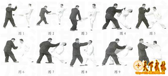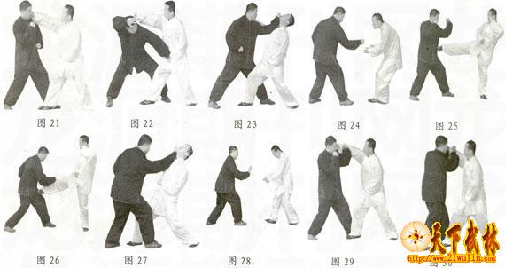 五、推窗望月:此招是后发治人的凶狠打法。无论甲方以任何拳法攻击乙方头部时,乙方进步身子下潜以拳或掌攻其裆部,没等对方反应攻敌之手,以肘部为圆心翻起来打其面门,紧接着再以后手拳将对方靠出(图21、22、2 3、24)
