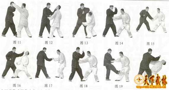 二、钻山锤:此拳就是形意拳中的钻拳,类似于拳击中的钩拳,快速多变也属重手拳。当甲方以直拳或摆拳攻击乙方头部时,乙方以后手拳挡住其来拳的同时,进身上步,再以前手拳猛击对方下腭,如甲方化解,再以后手变肘攻其头部。动作要连贯,一气呵成。(图10、11、12、13)