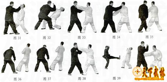 九、燕子抄水:此招也是形意拳中很少用的腿法之一,如能运用得当,威力惊人。当甲方以直拳攻击乙方头部时,乙方迅速以前手架住对方来拳。同时以后脚踩踏其膝部,利用踩踏的反作用力,踩踏之脚还未落地时又飞起第二脚,此法是形意拳中唯一的双脚离地的技法。(图37、38、39)