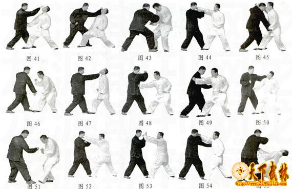 十三、巧女纫针:此招也是贴身近战的实用招法。当甲方左右直拳攻击乙方头部时,乙方以后手拳左右挡开其来拳,以前手拳重击敌方腋下,再以后手肘击其头部。(图52、53、54、55)