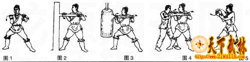 3、胸顶截肘吊袋功练习:面对吊袋手臂站立,双手轻轻推动吊袋,在吊袋手臂回摆至面前时,左脚速向后撤步(或右脚向前上步)避开吊袋手臂,左膝和脚略外展,右脚前掌内扣抵地,身体后移沉坐;同时,右手左上起经面前向右拨带刁抓吊袋手臂端,左手同时上起托抓住袋臂端下侧,两手合扣袋臂端顺时针向左肩外侧猛力旋拧拉拽。右脚随之向右前滑步,身体略左转,右手同时仰掌前伸托抓住袋臂肩腋处,胸部向前凸顶住袋臂肘关节之际,两手猛力向后抖掰袋臂端和袋臂肩腋处。意力运达两手十指及前胸部。目视吊袋肘臂(图3)。要注意体会胸顶手掰吊袋肘臂时的动衡感。