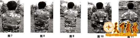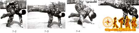 动作要领:在实战姿势基础上,身体前俯,双手变掌,左手由前向右后立臂格挡,手与头同高,右手由上向下向后挡击,自然后摆,左腿微屈站立,右脚脚面绷紧,脚心向后(图6-1),向后向上撩击,脚与胯同高,左手前伸与头同高,右臂自然后摆(图6-2) 身体稍向后仰,左手向下向后拍击,掌心向后,右手向上向后挡击,掌心向前,同时右脚提膝收起,脚面绷直向前弹蹋,脚与胯同高(图6-3),右脚落地顺势左转体90度,左臂向左格挡(图6-4),起右脚用右中边腿向左蹋出,脚与胯伺高,右手自然后摆(图6-5);迅速收回右脚在左脚跟后落地,左腿提膝抬起,用脚后跟着力向后蹬,力达脚跟,右手由下向上立臂格挡,左手自然后摆(图6-6);身体左转90度,同时左脚落地,咸实战姿势(图6- 7)。