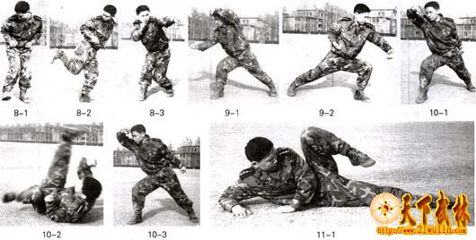 动作要领:右脚向前一大步,右小臂向上格挡,身体前跟(图10-1),以右小臂、头、肩和左腿外侧的顺序着地,向前滚翻,左腿收起,左大腿尽量向腹部靠近,左小腿向后靠近左大腿,在左腿外侧着地的同时,右腿伸直,脚面绷直,用力向前拍击(图10-2),身体借助惯性起立,成实战姿势,方向与动作前相反;身体向右转右脚向前上半步(图10-3),按照相同的动作要领重复动作一次。