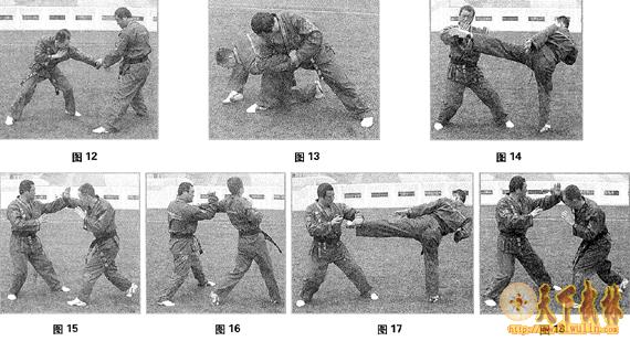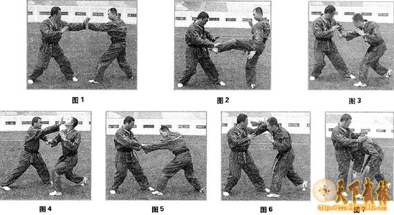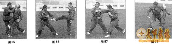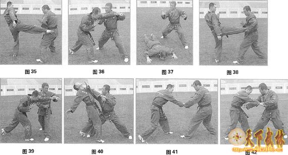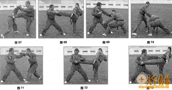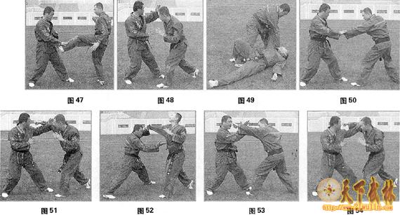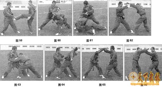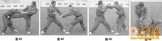 【解析】 练习退步横拨+闪步叼抓+拉臂切掌组合技术,掌握切掌技术的应用方法。 第十三式大鹏展翅(弓步?掌) ①双方搭手对峙。 ②当对方右脚前蹬踢我胸部时,我左脚向右闪步,左手托抓对方右脚跟(图38)。 ③对方右脚趁势向下踩落,左脚紧跟,以左冲拳向我胸部发动猛力攻击;我左脚迅速向左闪身移步,左掌向外叼抓对方左手腕(图39)。 ④随即我右脚向前进步,插入对方裆下,右掌从对方腋下横臂 出,将其向后掀翻倒地(图40)。 【解析】 练习闪步托抓+闪步抓扣+拉臂 掌组合技术,掌握 掌技术的应用方法。 第十四式乌龙探海(崩拳蹬腿) ①双方搭手对峙。 ②当对方右冲拳向我胸部打来,我两脚向后退一小步,左掌成“横掌”向下扣按对方左手臂(图41)。 ③随即我两脚向前上步,以右崩拳向前崩打对方右侧肋部(图42)。 ④对方迅速吞身收腹,我趁势两脚疾步向前,以右脚侧踹踢对方胸部,使其失重倒地(图43)。 【解析】 练习退步扣按+上步崩拳+疾步侧踹组合技术,掌握侧踹踢技术的应用方法。 第十五式螳螂捕蝉(搬臂反手) ①双方搭手对峙。 ②当对方左冲拳向我胸部打来,我两脚向后退一小步,左掌成“横掌”向下扣按对方左手臂(图44)。 ③对方趁势两脚上步,以右冲拳向我面部发动攻击;此时我左脚迅速向左闪步,以右掌再次叼抓对方右手腕(图45)。 ④随即我右掌抓握对方右手腕向上搬起,左掌从外向内用力按压对方肩关节外侧,将其压倒在地(图46)。 【解析】 练习退步扣按+闪步叼抓+搬臂压肩组合技术,掌握搬臂压肩技术的应用方法。 第十六式饿虎扑食(上步按掌) ①双方搭手对峙。 ②当对方左脚前弹踢我裆部时,我两脚向后退一小步,右掌成“俯掌”向下扣按对方左脚背(图47)。 ③不料对方左脚向前落步,右脚紧跟,以右掼拳向我左侧太阳穴发动猛力攻击;我左脚迅速向左闪步,左掌成“反掌”向外格挡对方右手臂(图48)。 ④随即我左掌顺势叼抓对方右手腕,两脚迅速向前上一大步,右掌成“俯掌”向前、向下卡掐对方脖颈,将其掐拿倒地(图49)。 【解析】 练习退步扣按+闪步格档+拉臂掐喉组合技术,掌握掐喉擒拿技术的应用方法。 第十七式弯弓射虎(弓步插掌) ①双方搭手对峙。 ②当对方左冲拳向我胸部打来,我两脚向后退一小步,右掌成“俯掌”向下扣按对方左手臂(图50)。 ③不料对方两脚上步紧逼,以右掼拳向我左侧太阳穴发动猛力攻击;我左脚向左闪步,左掌向外格挡对方右手臂(图51)。 ④随即我右掌成“仰掌”向前猛插对方心脏,使其胸部软骨组织损伤(图52)。 【解析】 练习退步扣按+闪步格挡+插掌组合技术,掌握插掌技术的应用方法。 第十八式天王托塔(勾脚上托) ①双方搭手对峙。 ②当对方左掼拳向我右侧头部打来,我两脚向前上步,右掌成“仰掌”向外挑拨对方左手臂(图53)。 ③不料对方两脚继续向前上步紧逼,再次以右掼拳向我左侧头部发动猛力攻击;此时我左脚向左闪步,左掌向外挑拨对方右手臂(图54)。 ④随即我左脚突然向前上一小步,以右膝关节撞击对方裆部;同时左掌抓按对方头顶,右掌向上推击对方下颌,使对方同时受到攻击,而受伤败阵(图55)。 【解析】 练习上步挑拨+闪步挑拨+顶膝推颌组合技术,掌握顶膝推颌技术的应用方法。 第十九式老牛摆头(转身捋合) ①双方搭手对峙。 ②当对方左脚前弹踢我裆部时,我两脚向后退一小步,左掌成“横掌”向下扣按对方左脚背(图56)。 ③对方左脚顺势向下落步,以右冲拳向我胸部发动猛力攻击;我两脚迅速向左闪步,右掌向外抓扣对方右手腕(图57)。 ④随即我右手抓腕向怀中带拉,左手搬住对方左腿膝关节窝,向外用力搬起,将其翻摔倒地(图58)。 【解析】 练习退步扣按+闪步叼抓+拉臂搬腿组合技术,掌握搬腿翻摔技术的应用方法。 第二十式御史传旨(双臂缠绕) ①双方搭手对峙。 ②当对方左脚前弹踢我裆部,我两脚向后退一小步,右掌成“俯掌”向下扣按对方左脚背(图59)。 ③对方左脚顺势落步,再次以右冲拳猛击我胸部;此时我左掌向外叼抓对方右手腕,并向外旋拧;两脚向前上步,右掌从对方右腋下穿过(图60)。 ④随即突然转体右掌缠绕对方右手臂,并向下扒按对方右肩,将对方擒拿在地(图61)。 【解析】 练习退步扣按+闪步叼抓+缠臂扒肩组合技术,掌握缠臂扒肩技术的应用方法。 第二十一式川流不息(进步按挤) ①双方搭手对峙。 ②当对方左掼拳向我右侧头部打来,我两脚向前上步,右掌向外格挡对方左手臂(图62)。 ③不料对方突然蹲身下潜,上步搂抱我腰;此时我身体重心迅速下移(图63)。 ④随即我两脚突然向前上步,右掌贴在左小臂内侧,以左掌向前按挤对方胸部,将对方向后腾空打出或挤按倒地(图64)。 【解析】 练习上步格挡+蹲身下移+进步按挤组合技术,掌握按挤技术的应用方法。 第二十二式黄龙搅水(拍脚摆莲) ①双方搭手对峙。 ②当对方左掼拳向我右侧太阳穴打来,我两脚向前上步,右掌向上架起对方左手臂(图65)。 ③不料对方此招为虚,两脚迅速上步紧逼,再次以右掼拳向我左侧太阳穴发动攻击;此时我左脚向左闪身移步,左掌向外挑拨对方右手臂(图66)。 ④随即我左脚向前上一小步,以右脚向外摆踢对方右侧肋部,使其肋部软骨组织损伤或折断(图67)。 【解析】 练习上步架掌+闪步挑拨+上步摆踢组合技术,掌握摆踢技术的应用方法。 第二十三式换景移山(横步扣打) ①双方搭手对峙。 ②当对方左脚侧弹