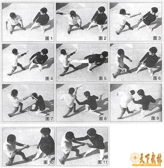 (图10)歹徒双手持短棒猛戳李小龙腹部。(图11)李小龙一手阻住短棒进攻的同时臀部侧移.另一只手戳向歹徒的眼睛。