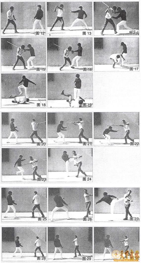 (图12)歹徒试图用长棍袭向李小龙。(图13~图14)李迅速前移用左手阻住他的双臂右拳同时猛击歹徒身体。(图15,图16)继握住歹徒的双臂,侧踢他的脚踝,致使其倒地。(图17)李小龙击倒歹徒,用脚踹向歹徒的肋骨来结束战斗(图18~图19)。