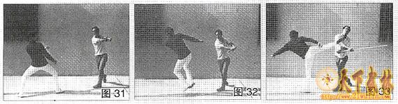 (图28~图30)歹徒挥动长棍打来,李小龙向后撤步,(图31~图32)当长棍打过头顶时,李小龙立刻跃起,踢向歹徒的面部(图33)。