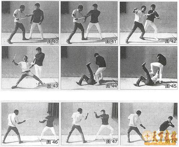 (图40~图41)歹徒欲抓李小龙领口处,同时挥刀便刺。李小龙则在第一时间迅速的握住歹徒左手,(图42)用右胳膊击向他肘部。(图43)同时有脚扫过把他绊倒在地,(图44~图45)在歹徒倒地的时候猛踩他的身体要害处。