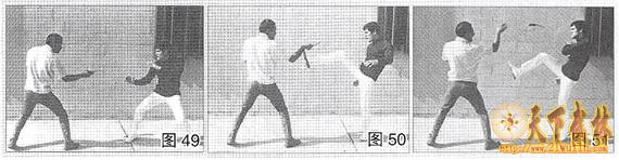 (图49)歹徒持刀刺向李小龙。(图50~图51)李小龙不待他立稳脚步,便迅即前踢他手腕关节,一击便中,歹徒刀掉在地上。